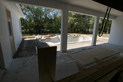 Here you can see how they have back-filled the area around the pool to bring it up near the level of the lanai. This area will be braced by a retaining wall and then capped with concrete, which will in turn be capped by the flocrete decorative finish.