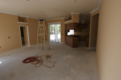 The work continues in the trim and paint phase of construction. At the same time the pool guys are making progress on that project. The photos that appear below show you some of the advancements that have been made to date. The painters actually worked today, a Sunday, and re-hung all the interior doors. The photos don't really convey the level of quality that the painters accomplished in their work. The trim carpenters have also been very busy and have been doing an amazingly high quality job; just study some of the details in things like the dining room columns and the fireplace for some idea how well they have done. Here we go with the update photos:
